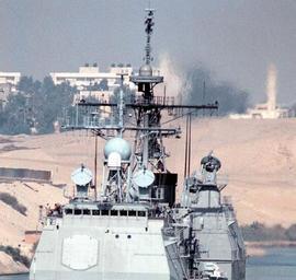 | Keywords: USS Normandy Radar.jpg Source Image-Source is http //www navsource org/archives/04/040160 htm Image is cut November 16th 1997 On board the nuclear powered aircraft carrier USS George Washington CVN 73 As seen from the aft of the USS George Washington the ticonderoga class Cruiser USS Normandy CG 60 underway in the Suez Canal Following a Presidential order to head for the Arabian Gulf region elements of the George Washington battle group led by the carrier immediately left their regularly scheduled station in the Mediterranean and began the 7 day passage to the Gulf which starts with a Suez Canal transit George Washington will join the USS Nimitz battle group already on station Both will enforce UN sanctions against Iraq by patrolling the No-Fly Zone under Operation Southern Watch U S Navy Photo by Photographer's Mate 1st Class James Westfall - Digital Film Scan 971116-N-1067W-002 PD-USN Aboard USS Normandy CG-60 Ship radars of the United States Navy AN/SPG-62 AN/SPQ-9 |
