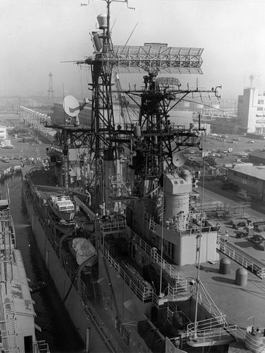 Keywords: USS Oklahoma City (CLG-5) amidships 1963.jpg Plan view amidships looking aft of the U S Navy guided missile cruiser USS Oklahoma City CLG-5 taken while undergoing an inclining experiment at the Long Beach Naval Shipyard California 28 September 1963 Note the ship's Mark 37 gun director with Mk 25 radar and radar antennas including SPS-10 and SPS-37/43 larger antenna atop the foremast; SPS-39 atop the mainmast; and SPS-30 atop the after mast Official U S Navy photograph http //www history navy mil/photos/images/h98000/h98686c htm NH 98686 1963-09-28 USN PD-USGov-Military-Navy USS Oklahoma City CLG-5 Ship radars of the United States Navy AN/SPS-30 AN/SPS-43 Long Beach Naval Shipyard 1963 in California |