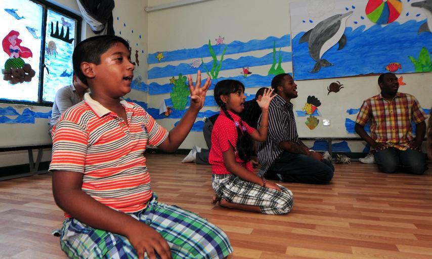 | Keywords: USS Pearl Harbor DVIDS317538.jpg  en Petty Officer 3rd Class Stephen Williams damage controlman center and Petty Officer 3rd Class Ralph Oliver religious programs specialist right perform breathing exercises during a yoga session with children at the RIA Institute in Manama Bahrain Sailors from the amphibious dock landing ship USS Pearl Harbor LSD 52 participated in a community relations project at the RIA Institute playing various games trying yoga and swimming Pearl Harbor is part of Peleliu Amphibious Ready Group supporting maritime security operations and theater security cooperation efforts in the U S 5th Fleet area of responsibility 2010-09-12 Petty Officer 2nd Class Michael Russell https //www dvidshub net/image/317538 100912-N-+++++-001 2010-09-12 02 46 BH PD-USGov-Military-Navy USS Pearl Harbor LSD-52 Manama Images from DoD uploaded by Fæ |
