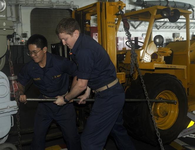 Keywords: USS Peleliu sailors at work 120616-N-SH505-056.jpg en Midshipmen 3rd Classes Dane Oshiro from Maui Hawaii and Spencer Michelson from Overland Park Kan break loose bolts on a 4 000-pound rough terrain fork lift's tire on board amphibious assault ship USS Peleliu Midshipmen are embarked aboard Peleliu as part of their Pacific training where they experience shipboard life prior to graduation 2012-06-16 left https //www dvidshub net/image/665794 120616-N-SH505-056 2012-09-17 02 41 PACIFIC OCEAN PD-USGov-Military-Navy USS Peleliu LHA-5 Images from DoD uploaded by Fæ