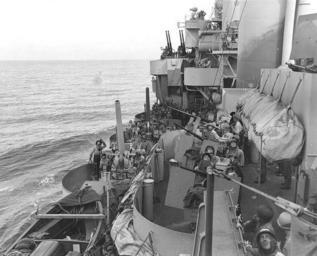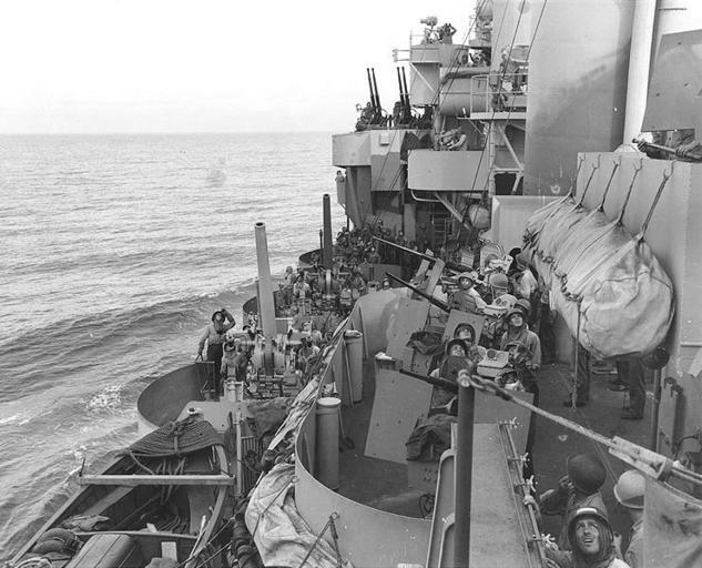 Keywords: USS Phoenix (CL-46) anti-aircraft gunners strain to identify a plane overhead, December 1944.jpg USS Phoenix CL-46 Crewmen at port side midships 5 /25 20mm and 40mm anti-aircraft guns strain to identify a plane flying overhead during the Mindoro invasion 18 December 1944 This was a time of intense Kamikaze attacks as the expressions on men's faces indicate Note whaleboat in the lower left anti-flash clothing and floater net enclosed in a bag at right http //www history navy mil/photos/images/g40000/g47471t jpg Naval Historical Center 1944-12-18 Official U S Navy Photograph PD-USGov-Military-Navy USS Phoenix CL-46 Oerlikon 20mm |