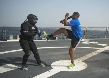 MAKE A MEME View Large Image USS STOUT (DDG 55) DEPLOYMENT 2016 161003-N-GP524-508.jpg en 161003-N-GP524-508 ARABIAN GULF Oct 3 2016 Ensign Carlos Ramos right conducts defensive fighting techniques after being sprayed with oleoresin capsicum during a security reaction ...