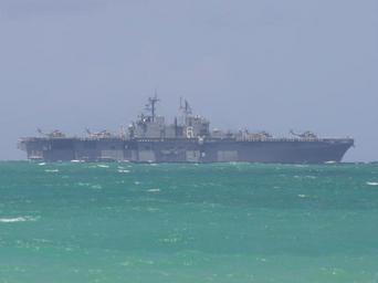 | Keywords: USSBonhommeRichardRIMPAC2008.jpg en USS Bonhomme Richard Amphibious Assault Ship LHD-6 off the coast of Oahu shortly before coming about and launching 4 helicopters Own Kagern 2008-07-27 Taken from a beach on Waimanalo Bay Oahu on the day of her arrival for RIMPAC 2008 Canon EOS Digital Rebel 477mm focal length General views of USS Bonhomme Richard LHD-6 RIMPAC 2008 |