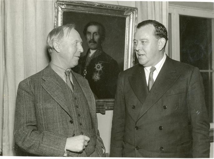 | Keywords: vårslipp 2012 vårslipp2012 trygve lie trygvelie andre verdenskrig andreverdenskrig 2. verdenskrig 2verdenskrig nordmenn i sverige under krigen nordmennisverigeunderkrigen people monochrome Under sitt besøk i Sverige i oktober-november 1944 arrangerte utenriksminister Trygve Lie på Grand Hotel i Stockholm en lunch, hvori deltok medlemmer av den svenske regjering, Norges og allierte nasjoners sendemenn i Sverige, fremstående norske og svenske militære sjefer o.a. Bildet viser utenriksminister Trygve Lie (t.h.) i samtale med den svenske finansminister Ernst Wigforss. Pa-1209, Serie Uc_66 Administrasjonen II Under sitt besøk i Sverige i oktober-november 1944 arrangerte utenriksminister Trygve Lie på Grand Hotel i Stockholm en lunch, hvori deltok medlemmer av den svenske regjering, Norges og allierte nasjoners sendemenn i Sverige, fremstående norske og svenske militære sjefer o.a. Bildet viser utenriksminister Trygve Lie (t.h.) i samtale med den svenske finansminister Ernst Wigforss. Pa-1209, Serie Uc_66 Administrasjonen II |