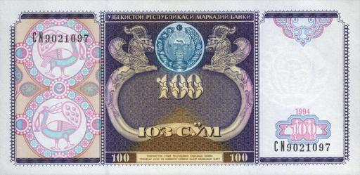 | Keywords: UZS100 1994 front.jpg  100 сум Узбекистана 1994 100 sum of Uzbekistan 1994 own scan 1994 Central Bank of the Republic of Uzbekistan Цент альный банк Республики Узбекистан Ўзбекистон Республикаси  а казий банки PD-UZ-exempt banknotes  Banknotes of Uzbekistan Banknotes with a face value of 100 1994 banknotes Peacocks on banknotes Coats of arms of Uzbekistan on banknotes |