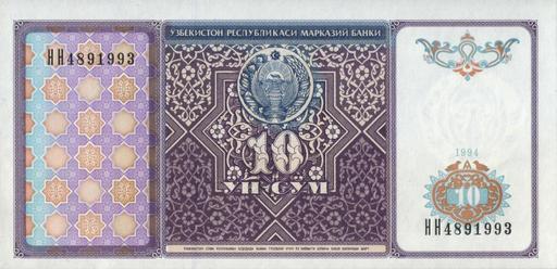 | Keywords: UZS10 1994 front.jpg  10 cум узбекистана 1994 10 soms of Uzbekistan 1994 Ouzbekistan Billet de 10 sums recto own scan 1994 Цент альный банк Республики Узбекистан The Central bank of the Republic of Uzbekistan Ўзбекистон Республикаси ма казий банки PD-UZ-exempt banknotes  Banknotes of Uzbekistan Banknotes with a face value of 10 1994 banknotes Coats of arms of Uzbekistan on banknotes |