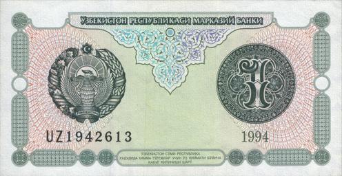 | Keywords: UZS1 1994 front.jpg  1 cум узбекистана 1994 1 som of Uzbekistan 1994 own scan 1994 Цент альный банк Республики Узбекистан The Central bank of the Republic of Uzbekistan Ўзбекистон Республикаси ма казий банки PD-UZ-exempt banknotes  Banknotes of Uzbekistan Banknotes with a face value of 1 1994 banknotes Green banknotes Coats of arms of Uzbekistan on banknotes |