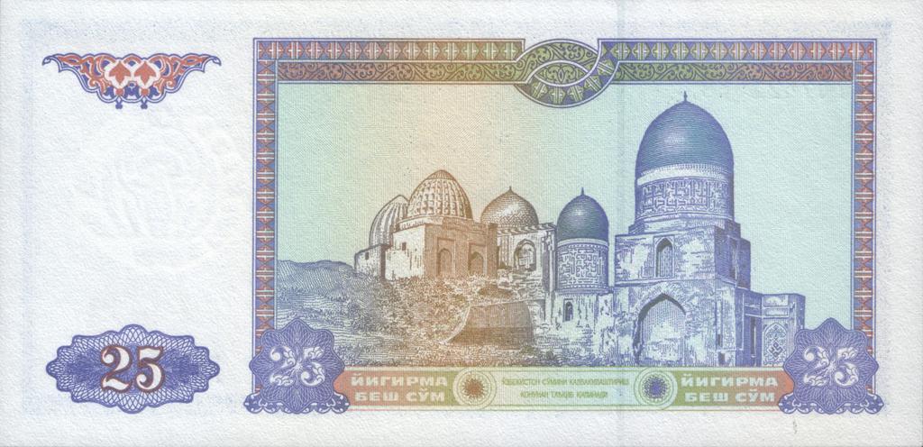| Keywords: UZS25 1994 back.jpg 25 cум узбекистана 1994 25 soms of Uzbekistan 1994 own scan 1994 Цент альный банк Республики Узбекистан The Central bank of the Republic of Uzbekistan Ўзбекистон Республикаси ма казий банки PD-UZ-exempt banknotes Banknotes of Uzbekistan Samarkand Shah-i-Zinda general views Banknotes with a face value of 25 Buildings on banknotes |