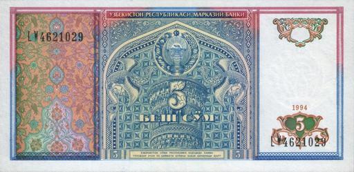 | Keywords: UZS5 1994 front.jpg  5 cум узбекистана 1994 5 soms of Uzbekistan 1994 own scan 1994 Цент альный банк Республики Узбекистан The Central bank of the Republic of Uzbekistan Ўзбекистон Республикаси ма казий банки PD-UZ-exempt banknotes  Banknotes of Uzbekistan Banknotes with a face value of 5 1994 banknotes Coats of arms of Uzbekistan on banknotes Dragons on banknotes |