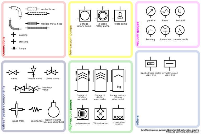 | Keywords: Vacuum symbols library.svg Several symbols of vacuum system components including vacuum pumps valves gauges etc The symbols probably are not standardized in the World Please make sure that they are commonly used in your country's vacuum engineering diagrams before you use them in any serious document екото ые символы компонентов вакуумных систем включая вакуумные насосы клапаны изме ительные п ибо ы и т д Об атите внимание что эти обозначения не общеп изнанные поэтому пе ед их использованием в се ьёзных документах убедитесь что они достаточно ши око используются в вашей ст ане date Own based on Ing Jaroslav KRÁL CSc Cvičení z vakuové techniky Vydavatelství ČVUT Prague 1996 FDominec Vacuum diagrams Symbol charts |