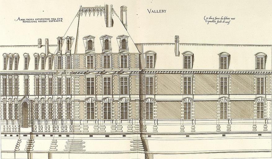 Keywords: Valleri faces.jpg fr Façades extérieures du château de Vallery le pavillon central et les deux hôtels Les plus excellents bastiments de France Androuet du Cerceau Jacques 1576 PD-old-100 Château de Vallery Le premier volume des plus excellents Bastiments de France |