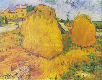 | Keywords: Van Gogh - Heuschober in der Provence.jpeg Heuschober in der Provence Wheat Stacks in Provence oil canvas 73 x 92 5 cm Otterlo KMM Van Gogh catalogues 425 1442 repro from art book Arles June 1888 Creator Vincent van Gogh PD-old-100 Other versions Landscape paintings by Vincent Van Gogh Arles 1888 Provence in art Paintings of wheat fields Haystacks in art |