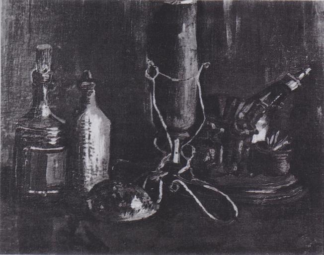 | Keywords: Van Gogh - Stillleben mit Flaschen, Vase und Muschel.jpeg Stillleben mit Flaschen Vase und Muschel Still life with bottles vase and shell Öl auf Leinwand auf Holz Oil on canvas on wood 30 5 x 40 cm Verbleib unbekannt Van Gogh catalogues 64 537 repro from art book Nuenen November 1884 Creator Vincent van Gogh PD-old-100 Other versions Van Gogh 1884-1885 | ||||
