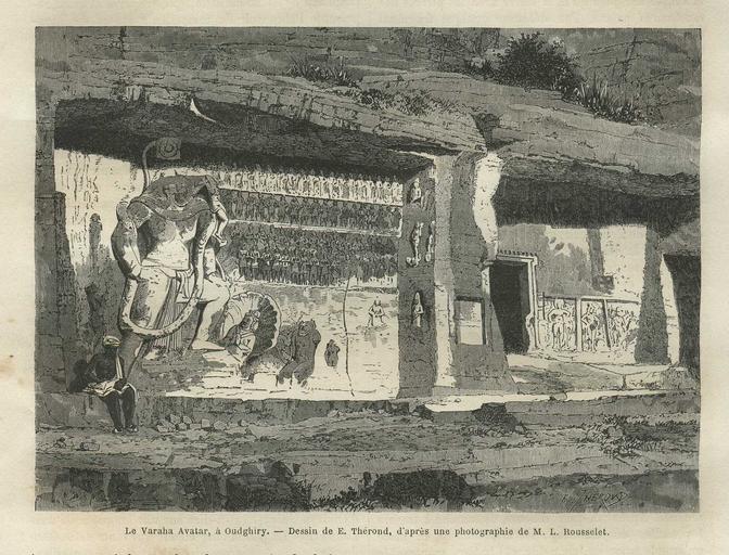 | Keywords: "Varaha Avatar, in Oudghiry" an engraving by E. Therond, from 'Le Tour du Monde', 1873.jpg Varaha Avatar in Oudghiry an engraving by E Therond from 'Le Tour du Monde' 1873; click on the engraving for a very large scan; also his Temple of Mahadeva Oudghiry Source ebay Nov 2008 http //www columbia edu/itc/mealac/pritchett/00routesdata/0400_0499/udaigiri/udaigiri html 1873 E Therond PD-Old | ||||