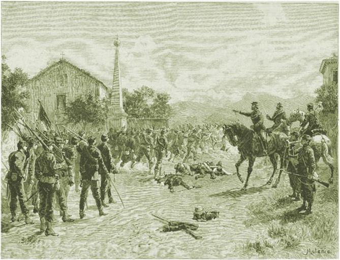 Keywords: Varese 1859.jpg en Second Italian War of Independence Garibaldi's Hunters of the Alps repel the attack of the Austrian division Urban in the Battle of Varese May 26 1859 Lithograph of the time reduced and modified it Seconda Guerra d'Indipendenza I Cacciatori delle Alpi di Garibaldi respingono l'attacco della Divisione Austriaca del Generale Urban nella Battaglia di Varese il 26 maggio 1859 Litografia dell'epoca ridotta e modificata Francesco Bertolini Storia del Risorgimento italiano F lli Treves Editori Milano 1889 Edoardo Matania 1847 “1929 1889 PD-old Battle of Varese Edoardo Matania Storia d'Italia by Francesco Bertolini 1859 in Italy |
