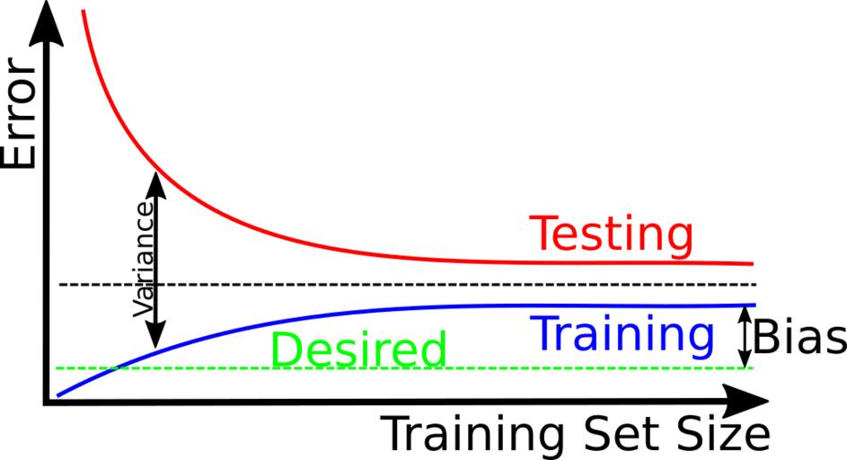 Keywords: Variance-bias.svg en Visualize the training error and testing error over the amount of available training data The more training data is available the less the variance is The bias is not affected by it de Visualisierung des Trainingsfehlers sowie des Testfehlers über die Anzahl der Trainingsdaten Je mehr Trainingsdaten verfügbar sind desto geringer ist die Varianz Der Bias ist davon nicht betroffen own MartinThoma 2016-02-19 Images by Martin Thoma/Computer Science Inkscape Machine learning Cc-zero |