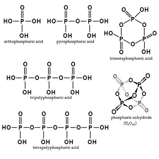 | Keywords: Various Phosphoric Acids.PNG Chemical Structures of Various Phosphoric Acids The following chemical structures are shown in this image orthophosphoric acid pyrophosphoric acid tripolyphosphoric acid tetrapolyphosphoric acid trimetaphosphoric acid phosphoric anhydride P<sub>4</sub>O<sub>10</sub> H Padleckas created this image file on October 21-22 2005 especially for use in the article Phosphoric Acids and Phosphates in Wikipedia H Padleckas 06 00 23 October 2005 UTC In November 2006 H Padleckas modified this image to revise the appearance of the P<sub>4</sub>O<sub>10</sub> molecular strucure H Padleckas 20 52 21 November 2006 UTC 2005-10-23 own assumed H Padleckas Phosphorus oxoacids Phosphoric acids |