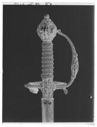 | Keywords: Värja, Frankrike 1658-1659 - Livrustkammaren - 2527-negative.tif LSH artwork sv Fäste av mörkanlöpt rikt snidat stål Knapp bukig med avsmalnande över- och nederdel Handbygel tämligen flack med vidgat mittparti Pareranordningen i övrigt bestående av en oval kryssbygel på utsidan en mycket kort nedåtböjd främre parerstång och en tämligen lång bakre parerstång spiralformigt böjd utåt-inåt Den snidade orneringen yttäckande På knappens fram- och baksida en karyatid med uppåtböjda armar på utsidan mellan karyatiderna figurscen med tre stående nakna kvinnor nedtill åtföljda av en påfågel och en Cupido till höger en sittande man med en stav i vänstra handen och ett äpple i den andra Paris väljer vem som är den skönaste kvinnan Juno Venus eller Minerva ; på insida en kentaur en stående naken man nedtill män som brottas eventuellt kentauerns strid mot lapitherna Figurscener återfinns även på handbygelns mittparti i form av stående nakna kvinnor på kryssets vertikalt utdragna ut- och insidor Herkules dödar jätten Antaeus Herkules bekämpar den den kretensiska tjuren samt på kryssbygelns mitt i form av en maskaron Kavellindning av tvinnad tunn silvertråd omväxlande med sju varv tvinnade grövre trådar av samma material dessa bestående av två parter vilka vardera i sin tur utgöras av tvinnade trådar; upptill och nedtill en flätad' krans av tvinnad förgylld tunn silvertråd Klinga rak tvåeggad slipad med två jämnbreda något konkava skär På starka delen mot nedetsad blånerad botten förgylld inskription i skrivstil På utsidan Car Gust Sereniss Suec Rex På insidan Belli Pacisque Sequester Carl Gustav den mest strå-lande konung av Sverige förmedlare av krig och fred Inskriptionerna inom en bård av förgylld rak rand ändarna insvängda original caption ca other date - 1658 1659 silver b6 - blankvapen - kavel och kavelklädsel material silvertråd - steel b2 - Blankvapen - klinga material stål - steel b1 - Blankvapen - fäste material stål g 670 size mm 25 klinga size mm 785 klinga size mm 957 size mm 111 LRK Karl X Gustav av Sverige basutställning Gallica 1945 Modelejon 2002 Vapens utsmyckning föredrag av Magnus Green och Florence Villén 17 feb 2011 för Vapenhistoriska Sällskapet 2011 Livrustkammaren Car Gust Sereniss Suec Rex Belli Pacisque Sequester anv b2 - blankvapen - klinga; Karl X Gustav av Sverige place of origin original filename LN_E04036 47350 inventory number LRK 10776 2527 CC0 Värja Frankrike 1658-1659 - Livrustkammaren - 2527 tif <gallery caption Different images of same object > File Värja Frankrike 1658-1659 - Livrustkammaren - 17588 tif File Värja Frankrike 1658-1659 - Livrustkammaren - 68952 tif File Värja Frankrike 1658-1659 - Livrustkammaren - 69980 tif File Värja Frankrike 1658-1659 - Livrustkammaren - 11087 tif </gallery> |
