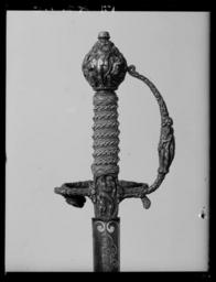 | Keywords: Värja, Frankrike 1658-1659 - Livrustkammaren - 2527.tif LSH artwork sv Fäste av mörkanlöpt rikt snidat stål Knapp bukig med avsmalnande över- och nederdel Handbygel tämligen flack med vidgat mittparti Pareranordningen i övrigt bestående av en oval kryssbygel på utsidan en mycket kort nedåtböjd främre parerstång och en tämligen lång bakre parerstång spiralformigt böjd utåt-inåt Den snidade orneringen yttäckande På knappens fram- och baksida en karyatid med uppåtböjda armar på utsidan mellan karyatiderna figurscen med tre stående nakna kvinnor nedtill åtföljda av en påfågel och en Cupido till höger en sittande man med en stav i vänstra handen och ett äpple i den andra Paris väljer vem som är den skönaste kvinnan Juno Venus eller Minerva ; på insida en kentaur en stående naken man nedtill män som brottas eventuellt kentauerns strid mot lapitherna Figurscener återfinns även på handbygelns mittparti i form av stående nakna kvinnor på kryssets vertikalt utdragna ut- och insidor Herkules dödar jätten Antaeus Herkules bekämpar den den kretensiska tjuren samt på kryssbygelns mitt i form av en maskaron Kavellindning av tvinnad tunn silvertråd omväxlande med sju varv tvinnade grövre trådar av samma material dessa bestående av två parter vilka vardera i sin tur utgöras av tvinnade trådar; upptill och nedtill en flätad' krans av tvinnad förgylld tunn silvertråd Klinga rak tvåeggad slipad med två jämnbreda något konkava skär På starka delen mot nedetsad blånerad botten förgylld inskription i skrivstil På utsidan Car Gust Sereniss Suec Rex På insidan Belli Pacisque Sequester Carl Gustav den mest strå-lande konung av Sverige förmedlare av krig och fred Inskriptionerna inom en bård av förgylld rak rand ändarna insvängda original caption ca other date - 1658 1659 silver b6 - blankvapen - kavel och kavelklädsel material silvertråd - steel b2 - Blankvapen - klinga material stål - steel b1 - Blankvapen - fäste material stål g 670 size mm 25 klinga size mm 785 klinga size mm 957 size mm 111 LRK Karl X Gustav av Sverige basutställning Gallica 1945 Modelejon 2002 Vapens utsmyckning föredrag av Magnus Green och Florence Villén 17 feb 2011 för Vapenhistoriska Sällskapet 2011 Livrustkammaren Car Gust Sereniss Suec Rex Belli Pacisque Sequester anv b2 - blankvapen - klinga; Karl X Gustav av Sverige place of origin original filename LN_E04036 47350 inventory number LRK 10776 2527 CC0 Värja Frankrike 1658-1659 - Livrustkammaren - 2527-negative tif <gallery caption Different images of same object > File Värja Frankrike 1658-1659 - Livrustkammaren - 17588 tif File Värja Frankrike 1658-1659 - Livrustkammaren - 68952 tif File Värja Frankrike 1658-1659 - Livrustkammaren - 69980 tif File Värja Frankrike 1658-1659 - Livrustkammaren - 11087 tif </gallery> Smallswords Media contributed by LSH dim-with multiple size templates Media contributed by LSH 2016-12 |