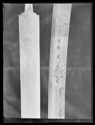 | Keywords: Värja - Livrustkammaren - 25691.tif LSH artwork sv Fäste av stål med påslaget silver i form av yttäckande mönster av rank- och figurmotiv silvret med spår av förgyllning Knapp stor nötformig något avsmalnande uppåt och med ovalt tvärsnitt nitknapp platt tämligen stor Pareranordning bestående av öppen handbygel med inåt-nedåböjd rundad övre ände och med två sidobyglar utgående åt vardera ut- och insidan stora S-svängda parerstänger höga fingerbyglar förenade nedtill med en tvärbygel omfattande en genombruten parerplåt ej autentisk Av de från handbygeln utgående sidobyglarna övergår den på utsidan i höjd med krysset i en tvärbygel som bågformig ansluter nedåt till utsidan av fingerbyglarnas nederändar Den inre sidobygeln övergår nedtill i tre sidospänger varav den främre ansluter till nederdelen av den främre fingerbygeln och de två andra till nederdelen av den bakre fingerbygeln <br/>Kaveln lindad med tunn mässingstråd omväxlande slät och tvinnad lindningen ej autentisk <br/><br/>Klinga rak och tämligen bred tvåeggad flackslipad Utan ricasso baspartiet innan förfingerbyglarna eggslipat Starka delens utsida med påslagen ornering i orientalisk stil av bladrankor i guld och silver guldet i två nyanser original caption värja - LRK 6361 ca other date - 1500 1600 steel b12 - blankvapen - fäste och klinga material stål - gold b5 - blankvapen - klingdekor material guld - silver b45 - blankvapen - fäste och klingdekor material silver size mm 975 size mm 220 size mm 817 klinga size mm 44 klinga g 1790 LRK Gustav II Adolf av Sverige Gustav II Adolf Minnesutställning 1932 1932 Gustav II Adolf 350 år efter Lützen 1982-1984 place of origin original filename LN_A00083_000083 41651 inventory number LRK 6361 25691 CC0 Värja - Livrustkammaren - 25691-negative tif <gallery caption Different images of same object > File Svärdfejare värja - Livrustkammaren - 105 tif File Svärdfejare värja - Livrustkammaren - 77149 tif File Svärdfejare värja - Livrustkammaren - 126 tif File Svärdfejare värja - Livrustkammaren - 127 tif </gallery> Sword images from Livrustkammaren Sabre images from Livrustkammaren Media contributed by LSH unmatched material Media contributed by LSH dim-with multiple size templates Media contributed by LSH 2014-06 |
