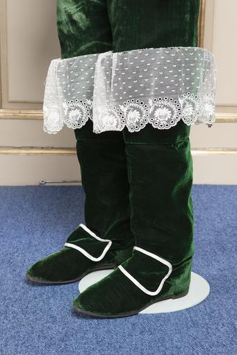 | Keywords: Vasaordens stövlar med brysselspets, 1829 - Livrustkammaren - 108335.tif LSH artwork sv Buren av brukspatronen friherre Per Adolf Tamm 1774-1856 <br/>Stövel för höger fot av grön sammet skuren med reseft som i rak sneddad linje går bakom klackens hörn- Skaft som är ihopsytt bak trattformig krage med sömmar fram och bak Sulan randsydd klacken mycket låg med blott en klacklapp som har stickats fast med vit tråd ytterst bak och innert Klacken har 3 pinnhålsstämplar slitna placerade i triangel Sulan har strax före hålfoten 2 kraftiga pinnhålsstämplar liksom en i tåpartiet <br/>Stövlarna är invändigt fodrade med ljusgult getskinn kragen är försedd med styvnad av papp och foder av vit taft I skaftet insydd stropp b 27 mm l 120 mm kypervävnad med ränder i grönt svart och gulrosa Över kragen hänger en vit Bryssel-spets totalbredd 190 mm 150 mm ned Spetsen har en uddad kant med en blomsterkvist som bildar en 70 mm bred rapport Spetsen är ihopsydd baktill <br/>Till stöveln hör sporrläder e2 av grön sammet kantad med vit sidenatlas och fodrad med vit taft 2 tränsar av sammetsremsor är påsydda l 183 mm bredd 80-65 mm original caption Vasaordens stövlar med brysselspets 1829 <br/> Nyckelord Sammet Skor Föremålsbild Vasaorden Stövlar 1829 velvet Färg grön d1 - dräkt - yttermaterial material sammet - morocco leather Färg gul d2 - dräkt - foder material marokäng - lace d6 - dräkt - krage epåletter manschetter material spets - silk Färg vit d4 - dräkt - passpoaler band kantning uppslag material sidenatlas - taffeta Färg vit d2 - dräkt - foder material sidentaft - leather D - DRÄKT material läder size mm 190 krage size mm 330 krage size mm 70 klack size mm 15 klack size mm 540 size mm 83 fot size mm 275 fot LRK Per Adolf Tamm friherre brukspatron Ordensutställningen 1948 Ordensutställningen 2004 Kungl Maj ts Orden basutställning 2005-2016 Stockholms slott place of origin original filename lm_dig22009 64118 inventory number LRK 27524 108335 CC0 Jens Mohr <gallery caption Related objects > File Vasaordensdräkt 1829 - Livrustkammaren - 77772 tif LRK 19455 File Vasaordens häroldsdräkt 1829-tal - Livrustkammaren - 108333 tif LRK 27523 File Rock tillhörande Vasaordensdräkt - Livrustkammaren - 364 tif LRK 19453 </gallery> Order of the Vasa Velvet Footwear Boots Jens Mohr Media contributed by LSH dim-with multiple size templates Media contributed by LSH 2016-05 |