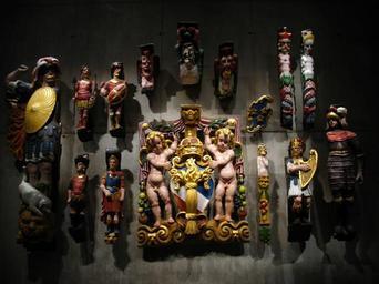 Keywords: Vasaskultpurrepliker.jpg and original placing of the sculptures is as follows starting from the left top row first Warrior in Roman armor with a lion and a dog by its feet; the upper starboard side of the bow In this sculpture the lion and dog represent gentleness and compassion towards the weak Warrior in Roman armor Warrior in Roman armor Grotesque console head; lower port quarter gallery Grotesque console head; the corner where the lower stern gallery meets the starboard quarter gallery It shows a figure with bare chest writhing in agony as snakes slither in and out of the orifices of its head It represents death and decay and is placed below the sculpture of the young Hercules one of two Hercules images on the ship Grotesque console head; lower port quarter gallery Shield from the coat of arms of Sweden; the upper part of the transom The three crowns have been the symbol of Swedish kings since the Middle Ages This shield is part of the much larger series of sculptures that consist of an embellished depiction of the national coat of arms flanked by two lions and surrounded on three sides by draperies held up by putti images of small chubby babies Herm designed as a triton; upper starboard quarter gallery The sculpture is dressed in a Roman Catholic prelate's biretta a type of priest's hat which mocks the Catholic faith the ship was intended to be used in a war that was waged primarily between Protestants and Catholics Caryatid designed as a mermaid; upper starboard quarter gallery Warrior clad in Roman armor; lower port quarter gallery The Roman emperor Titus; starboard side of the beakhead The coat of arms of the House of Vasa; middle of the lower stern gallery The coat of arms portraying a vase sheaf the namesake of the ship is flanked by two cherubs holding olive branches and is surrounded by ornamentation Pilaster representing the phlegmatic humor; forward tower of the lower starboard quarter gallery King David playing a harp; the lower stern gallery right below the coat of arms of the House of Vasa A Gothic warrior in 17th century armor; the lower stern gallery next to the coat of arms of the House of Vasa ImageNote 1 901 700 829 1027 2592 1944 2 The coat of arms of the House of Vasa; middle of the lower stern gallery The coat of arms portraying a vase sheaf or straw bundle the namesake of the ship is flanked by two cherubs holding olive branches and is surrounded by ornamentation ImageNoteEnd 1 ImageNote 2 23 369 405 1348 2592 1944 2 Warrior in Roman armor with a lion and a dog by its feet; the upper starboard side of the bow In this sculpture the lion and dog represent gentleness and compassion towards the weak ImageNoteEnd 2 ImageNote 3 1669 638 211 298 2592 1944 2 Shield from the coat of arms of Sweden; the upper part of the transom The three crowns have been the symbol of Swedish kings since the Middle Ages This shield is part of the much larger series of sculptures that consist of an embellished depiction of the national coat of arms flanked by two lions and surrounded on three sides by draperies held up by putti images of small chubby babies ImageNoteEnd 3 ImageNote 4 1925 930 266 761 2592 1944 2 King David playing a harp; the lower stern gallery right below the coat of arms of the House of Vasa ImageNoteEnd 4 ImageNote 5 467 392 424 583 2592 1944 2 Warriors in Roman armor ImageNoteEnd 5 ImageNote 9 1879 156 168 755 2592 1944 2 Herm designed as a triton; upper starboard quarter gallery The sculpture is dressed in a Roman Catholic prelate's biretta a type of priest's hat which mocks the Catholic faith the ship was intended to be used in a war that was waged primarily between Protestants and Catholics ImageNoteEnd 9 ImageNote 10 2044 178 156 729 2592 1944 2 Caryatid designed as a mermaid; upper starboard quarter gallery ImageNoteEnd 10 ImageNote 11 2206 680 288 975 2592 1944 2 A Gothic warrior in 17th century armor; the lower stern gallery next to the coat of arms of the House of Vasa ImageNoteEnd 11 ImageNote 12 1746 966 133 726 2592 1944 2 Pilaster representing the phlegmatic humor; forward tower of the lower starboard quarter gallery ImageNoteEnd 12 ImageNote 13 437 1027 217 700 2592 1944 2 Warrior clad in Roman armor; lower port quarter gallery ImageNoteEnd 13 ImageNote 14 674 988 211 716 2592 1944 2 The Roman emperor Titus; starboard side of the beakhead ImageNoteEnd 14 ImageNote 15 917 139 729 557 2592 1944 2 See File Vasa grotesque replicas jpg for closeup ImageNoteEnd 15 Vasa Museum - Reconstructions of ship sculptures 17th-century wood carving Wood carving in Sweden Ship decorations Mannerist sculptures in Sweden Putti in supporters Sculptures of King David playing harp |