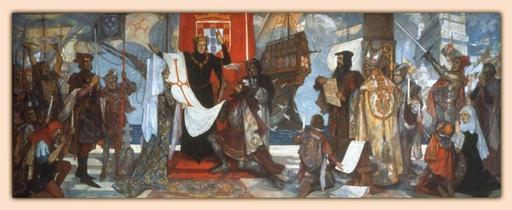 | Keywords: Vasco da Gama Leaving Portugal,.jpg en Vasco da Gama Leaving Portugal mural by John Henry Amshewitz RBA 1882-1942 ; British/South African In the painting Abraham ben Samuel Zacuto is shown presenting his astronomical tables to da Gama before his departure from Lisbon in 1497 The mural resides in the William Cullen Library at the University of the Witwatersrand Johannesburg 1936 http //usm maine edu/maps/exhibit8/nrnav html http //usm maine edu/ photograph by courtesy of the Archives of the University of the Witwatersrand Johannesburg John Henry Amshewitz PD-old-auto-1996 South Africa 1996-01-01 1942 Uploaded with UploadWizard Paintings by John Henry Amshewitz Vasco da Gama Murals in South Africa Departing in art |