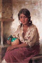 | Keywords: Vastagh Girl with a Jar.jpg Artwork Creator György Vastagh Oil on canvas Size cm 42 57 Private collection object history exhibition history credit line bottom right Vastagh Gy accession number http //www viragjuditgaleria hu/ Virág Judit Galéria http //viragjuditgaleria hu/en/item/30/ Info http //viragjuditgaleria hu/pics/paintings/vastagh_gyorgy-lany_korsoval-1_30 jpg Pic PD-old-70 Paintings by György Vastagh Portrait paintings of girls 19th-century paintings location missing Paintings with signatures Jugs in art Girls looking at viewer in art 19th-century portrait paintings of girls Portrait paintings of sitting girls Females looking at viewer in art People and walls in art Paintings in unidentified private collections 19th-century paintings in private collections Braids in art year missing |