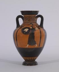 Keywords: Vatican G 23 Group - Black-figure Pseudo-Panathenaic Amphora with Discus Thrower - Walters 482109 - Side A.jpg Panathenaic amphorae were prizes given to victors at the Panathenaic all-Athens festival the great state festival of Athens It was held every four years much like the Olympic games The prize amphorae were quite large and contained olive oil the most valuable part of the award Smaller versions such as this one were produced as commemorative objects Each Panathenaic vase depicts a striding armed Athena on the front As the city's patron goddess in whose honor the festival was given she was thought to preside over the games The back shows the particular event for which the prize was given Here the contest is discus-throwing and a competitor appears with his trainer holding a staff and another athlete ca 500 485 BC Classical terracotta cm 38 1 23 5 accession number 48 2109 32454 William Randolph Hearst San Simeon date and mode of acquisition unknown William Randolph Hearst Estate Sale May 1958 no 5494 Walters Art Museum 1958 by purchase Museum purchase 1958 Goddess and Polis The Panathenaic Festival in Ancient Athens Hood Museum of Art Hanover; Tampa Museum of Art Tampa; Virginia Museum of Fine Arts Richmond; Princeton University Art Museum Princeton 1992-1993 Heroes Mortals and Myths in Ancient Greece The Walters Art Museum Baltimore; Frist Center for the Visual Arts Nashville; San Diego Museum Of Art San Diego; Alexander S Onassis Public Benefit Foundation USA New York 2009-2011 place of origin Athens Greece Walters Art Museum license Ancient Greek black-figure pottery in the Walters Art Museum Group of Vatican G 23 Pseudo-Panathenaic amphoras Athena in ancient Greek pottery Media contributed by the Walters Art Museum needs artist update |