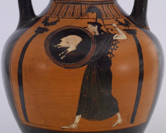 Keywords: Vatican G 23 Group - Black-figure Pseudo-Panathenaic Amphora with Discus Thrower - Walters 482109 - Side A Detail.jpg Panathenaic amphorae were prizes given to victors at the Panathenaic all-Athens festival the great state festival of Athens It was held every four years much like the Olympic games The prize amphorae were quite large and contained olive oil the most valuable part of the award Smaller versions such as this one were produced as commemorative objects Each Panathenaic vase depicts a striding armed Athena on the front As the city's patron goddess in whose honor the festival was given she was thought to preside over the games The back shows the particular event for which the prize was given Here the contest is discus-throwing and a competitor appears with his trainer holding a staff and another athlete ca 500 485 BC Classical terracotta cm 38 1 23 5 accession number 48 2109 32454 William Randolph Hearst San Simeon date and mode of acquisition unknown William Randolph Hearst Estate Sale May 1958 no 5494 Walters Art Museum 1958 by purchase Museum purchase 1958 Goddess and Polis The Panathenaic Festival in Ancient Athens Hood Museum of Art Hanover; Tampa Museum of Art Tampa; Virginia Museum of Fine Arts Richmond; Princeton University Art Museum Princeton 1992-1993 Heroes Mortals and Myths in Ancient Greece The Walters Art Museum Baltimore; Frist Center for the Visual Arts Nashville; San Diego Museum Of Art San Diego; Alexander S Onassis Public Benefit Foundation USA New York 2009-2011 place of origin Athens Greece Walters Art Museum license Ancient Greek black-figure pottery in the Walters Art Museum Group of Vatican G 23 Pseudo-Panathenaic amphoras Athena in ancient Greek pottery Media contributed by the Walters Art Museum needs artist update |