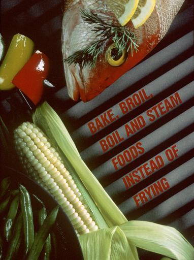 | Keywords: Vegatables and fish.jpg From an overhead angle red diagonal letters reading Bake broil boil and steam foods instead of frying sit on a grill The letters are surrounded by fish corn beans and red/yellow peppers on a skewer Shot on 4x5 format This was used in the 1989 calendar Eat for Good Health July 1989 Topics/Categories Food and Drink Type Color Photo Source National Cancer Institute Bill Branson Photographer 2434 The Web site of the National Cancer Institute http //www cancer gov 1989-01 Reuse Restrictions None - This image is in the public domain and can be freely reused Please credit the source and/or author listed above Bill Branson Photographer PD-USGov-HHS-NIH Media from National Cancer Institute Visuals Online Images uploaded by Fæ Health education |