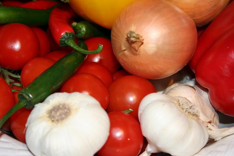 Keywords: vegetables pepperoni garlic onions tomatoes paprika nachtschattengewächs chilli pepper frisch healthy vitamins red chili