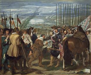 | Keywords: Velázquez - de Breda o Las Lanzas (Museo del Prado, 1634-35).jpg  Artwork Creator Diego Velázquez The Surrender of Breda or žThe Lances Las lanzas o La rendición de Breda De overgave van Breda Die à bergabe von Breda 1635 oil on canvas cm 307 367 institution Prado 1 9A P01172 https //www museodelprado es/coleccion/galeria-on-line/galeria-on-line/obra/la-rendicion-de-breda-o-las-lanzas/ no_cache 1 Museo del Prado Madrid object history Colección Real Palacio del Buen Retiro Madrid 1701 nº 244; Palacio Real Nuevo antecámara de la serenÃsima infanta 1772 nº 244; Palacio Real Nuevo Madrid pieza de vestir 1794 nº 244; Palacio Real Madrid 1ª pieza de vestir 1814-1818 nº 244 credit line exhibition history source Other versions Q1133420 PD-old-100 Uploaded with UploadWizard La rendición de Breda Taken with Hasselblad H4D-50 |
