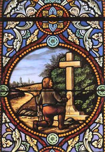 Keywords: Vendéan praying.jpg en Stained glass window of the Chappel of the Martyrs of Saint-Martin-des-Tilleuls showing a Vendéan peasant praying in front of a cross before a battle http //www loire-france com/histoire/guerres-vendee/vitraux/galerie/pages/vitrail-026 htm Anonymous 1925 War of Vendée on stained glass windows Stained glass windows in Vendée Churches in Saint-Martin-des-Tilleuls Chapels in Vendée PD-old