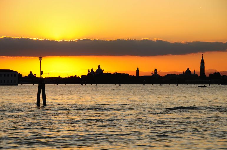 Keywords: venice tourism italy architecture monument rialto historic buildings urban urban landscape city street old old building channel dusk landscape sunset orange red sea backlight background image sun light outdoors horizon evening sun the light of the sun holiday orange sky
