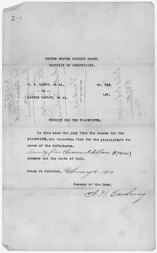 | Keywords: Verdict for the plaintiffs in the case of Loewe v. Lawlor - NARA - 278246.tif Scope and content This document is part of the file on the case of Loewe v Lawlor In 1901 - 1902 the United Hatters of North America attempted to unionize the employees of Dietrich Loewe and Partners a hat making company in Danbury CT When the company resisted the attempt to unionize its employees and the union called a strike and a nation-wide boycott of the company's products Loewe then sued the 191 members of the local for violating the Sherman Antitrust Act The US District Court agreed with the plaintiff and fined the union 74 000 The Circuit Court of Appeals 2nd Circuit overruled this decision but then the US Supreme Court revised the Court of Appeals decision and sent the case back for retrial in 1908 The union again lost in 1912 and was fined 250 000 Because the union was not incorporated the individual union members were liable for the fine In 1917 the US District Court ordered the sale of the homes of 140 members of the local union in order to pay for the fine General notes 278246 Local identifier U S Circuit Court for the District of Connecticut 09/24/1789 - 01/01/1912 NARA's Northeast Region Boston NRAAB 380 Trapelo Road Waltham MA 02452-6399 date 1910 02 04 - 1910 02 04 Record group Record Group 21 Records of District Courts of the United States 1685 - 2004 Record group ARC 350 Case Files compiled 1790 - 1911 Series ARC 593465 File unit Loewe v Lawlor 08/1903 - 01/05/1915 File unit ARC 278237 Variant control numbers NAIL Control Number NRAB-21-CASECCCT-538LAW-I yes Other versions NARA-cooperation PD-USGov United States district court cases February 1910 Unions sindicatos and social movements Strikes in the 1900s 1910 documents Danbury Connecticut 1910 in the United States |