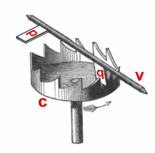 | Keywords: Verge Escapement Labelled.png  Drawing of verge escapement used in antique clocks and watches Invented in the 13th century it was the mechanism used in all clocks and watches for 400 years until about 1660 The labeled parts are c crown wheel v verge p q pallets An error in the drawing is that the crown wheel is shown with 12 teeth; verge escapements must actually have an odd number of teeth to function Alterations Removed pendulum crutch Erased upper pallet which was drawn incorrectly parallel to the other pallet and redrew pallet in correct position Removed caption and part labels replaced labels with new colored ones Downloaded from http //books google com/books id 0G8DAAAAQAAJ pg PA153 Henry Evers 1874 A Handbook of Applied Mechanics William Collins Sons London fig 58 p 153 on Google Books published 1874 Henry Evers Public domain - author died more than 70 years ago Image Verge_Escapement png PD-old Verge Escapement Old horology prints |
