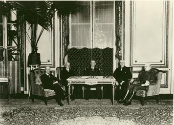 Keywords: president wilson paris france fourteen points fourteenpoints versailles robert lansing robertlansing diplomat henry white henrywhite general tasker bliss generaltaskerbliss Local Accession Number: 1811 Description: Pictured left to right: Colonel Edward House, Secretary of State Robert Lansing, President Wilson, Diplomat Henry White, General Tasker Bliss. Photographer: Unknown Source: Princeton University Library Size: 8x10 Medium: Print, Black and White Date: 1918 Local Accession Number: 1811 Description: Pictured left to right: Colonel Edward House, Secretary of State Robert Lansing, President Wilson, Diplomat Henry White, General Tasker Bliss. Photographer: Unknown Source: Princeton University Library Size: 8x10 Medium: Print, Black and White Date: 1918 |