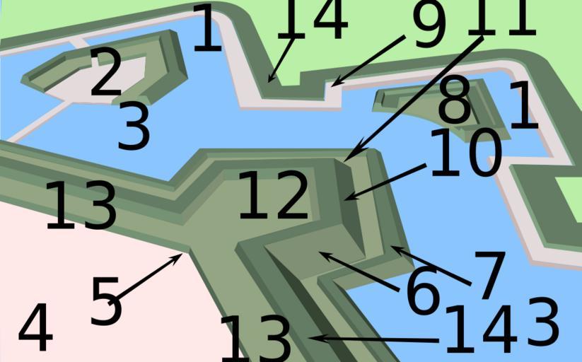 | Keywords: Vestingtermen.svg Vesting termen Ravelijnsgracht 1 Ravelijn 2 Hoofdgracht 3 Terreplein 4 Keel 5 Flank 6 Onderwal 7 Halve Maan 8 Bedekte Weg 9 Face 10 Saillant 11 Bastion 12 Courtine 13 Bovenwal 14 own 2011 Arch free Floor plans of fortresses Star forts |