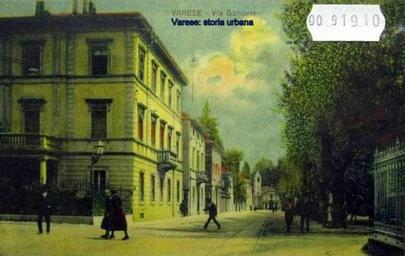 Keywords: Versione colorata. Vista sulla via Dandolo all'incrocio con via Cavour (a destra) e via Sabotino (a sinistra). A destra il pubblico passeggio alberato donato nel 1816 dal conte Vincenzo Dandolo alla municipalità di Varese. Sullo sfondo la chiesa della Madonnina in Prato. varese viavincenzodandolo |