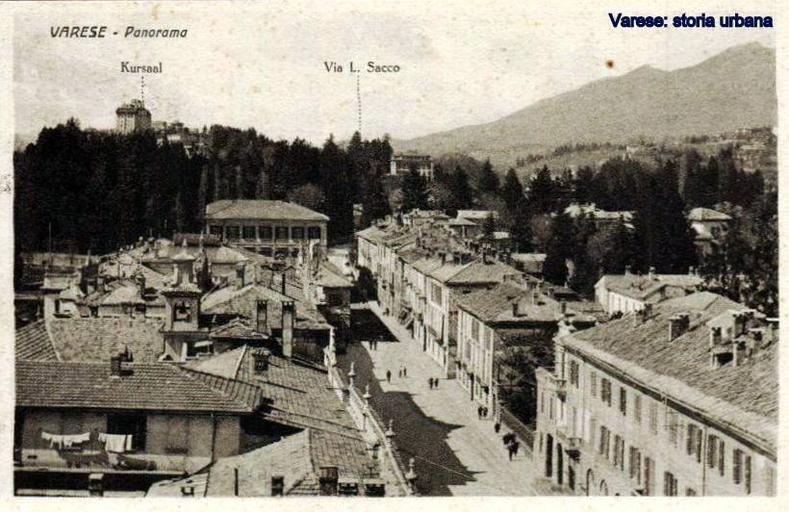 Keywords: Vista dall'alto di via Sacco. Dopo Palazzo Estense (1766-73), in fondo il basso edificio della filanda costruita nel 1837 e abbattuta nel 1932 e dietro l'edificio multipiano della scuola media che venne costruito nel 1903 e rasa al suolo negli anni '70. Sul colle Campigli sono visibili a sinistra le costruzioni del Palace Hotel e del Kursaal e a destra della villa villa Molinari-Craven-Seyssel d'Aix (arch. Giuseppe Antonio Bianchi, seconda metà del XVIII sec.). varese palazzoestense |