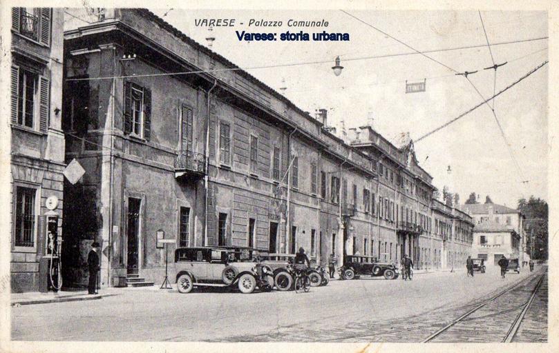 Keywords: A sinistra (dietro la pompa di benzina) scorcio della casa Sacco/Ghirlanda (arch. Francesco Peverelli, 1808) sostituita nel 1964 dal palazzo della Banca d'Italia (arch. Ignazio Gardella), segue Palazzo Estense (arch. Giuseppe Antonio Bianchi, 1766-73). In fondo il basso edificio della filanda costruita nel 1837 e abbattuta nel 1932 e dietro l'edificio multipiano della scuola media che venne costruito nel 1903 e abbattuto negli anni '70. varese palazzoestense |