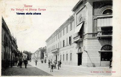 Keywords: A sinistra Palazzo Estense (arch. Giuseppe Antonio Bianchi, 1766-73). Di fronte la casa ad angolo che ospita l'albergo Europa (1855). In fondo a Palazzo Estense la filanda costruita nel 1837 e abbattuta nel 1932. Sul fondo si intravede il parco di villa Baroggi. varese palazzoestense |