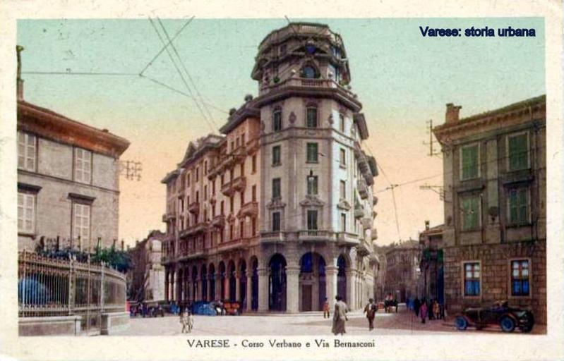 Keywords: Versione colorata. In centro palazzo De Micheli e di seguito, affacciato su via Verbano (ora Marcobi), il palazzo della Banca Commerciale Italiana, entrambe sono opere della fine degli anni '20 dell'ing. Edoardo Flumiani. Segue la stretta casa Crugnola (ing. Zafferri) che si affaccia nel vuoto (sono visibili i lavori di demolizione delle vecchie case) in attesa della costruzione di palazzo Verga (ing. Mario Cantù). All'estrema destra uno scorcio di casa Sacco/Ghirlanda (arch. Francesco Peverelli, 1808) sostituita nel 1964 dal palazzo della Banca d'Italia (arch. Ignazio Gardella). varese viaverbano viawaltermarcobi |