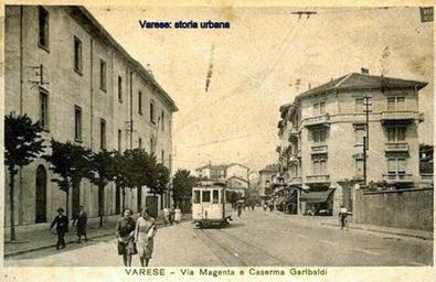 | Keywords: Vista di via Magenta all'incrocio con viale Umberto I (a destra), a sinistra la caserma Garibaldi (arch. Silvio Spinelli, 1861). Sulla destra il parco della villa Dandolo (1810), sorta sui resti l'antico convento dell'Annunciata (1468), che verrĂ sostituito da un impattante edificio negli anni '60. tram varese viamedagliedoro casermagaribaldi vialeumbertoi |