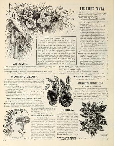 Keywords: Vick's garden and floral guide (16537221106).jpg see Novelty Pages <br> These Morning Glories have given great satisfaction Their <br> exquisite beauty and enormous size from four to six inches <br> across 1 with their innumerable markings and shadings com- <br> mand the admiration of all flower lovers The vines are strong COB <br> and robust attaining a height of 30 to <br> 50 feet while the foliage is quite distinct <br> and luxuriant <br> Price per packet JO cents <br> BRAZILIAN MORNING GLORY <br> Ipomcea setosa <br> A most interestingclimbcr with rose <br> colored flowers from 3 to 4 inches in <br> diameter and a leaf 8 to 12 inches <br> across It presents a remarkable ap- <br> pearance branching in every direction <br> and intertwining so as to make it abso- <br> lutely impenetrable to the sun's rays <br> The large seed pods or curious looking <br> capsules with short reddish hairs on <br> the stems make it unusually orna- <br> mental andattractivc After planting <br> morning glory pour on scalding water Annual <br> Ipomcea setosa 'Brazilian Morning Glory 10 <br> 40 <br> DOLICHOS Lablab Hyacinth Bean\ fine <br> climber six to twenty feet high purple and <br> lilacflowers ounce 20 cents 5 <br> VARIEGATED JAPANESE HOP <br> Humulus Japonicus <br> A splendid annual climber rapidly covering arbors <br> walls trellises etc The foliage resembles that of the <br> common Hop but is more dense Seed sown in the <br> open ground in spring will produce large plants in <br> a short time Withstands heat drought and insects <br> Japanese Hop Humulus Japonicus 10 <br> Japanese Variegated Hop leaves green and <br> white variegated xo <br> COBCEA <br> One of the very finest and most <br> beautiful annual climbers of large <br> size rapid growth fine foliage <br> bell-shaped flowers almost 1 in - <br> across and 2 in long Ingoodsoil <br> the stems often grow 20 or 30 feet <br> long and cover a large surface <br> Plants begin flowering when quite <br> young Put seed in moist earth <br> edge dtnvn; do not water until the <br> young plants appear unless earth <br> is very dry Remove plants to the <br> house for winter blooming <br> Coboea scandens 10 <br> CARDIOSPERMUM <br> HALICACABUM or Balloon Vine <br> Annual 43864393 149533 78224 Page 40 Text http //www biodiversitylibrary org/page/43864393 1900 10 5962/bhl title 78224 Henry G Gilbert Nursery and Seed Trade Catalog Collection ; James Vick's Sons Rochester N Y Biodiversity Heritage Library Vick's garden and floral guide 1900 Garden Stories Catalogs Commerce Flowers Gardening James Vick's Sons Rochester N Y Rochester N Y Seeds Vegetables U S Department of Agriculture National Agricultural Library bhl page 43864393 dc identifier http //biodiversitylibrary org/page/43864393 James Vicks Sons bhlGardenStories Climbers BHLinbloom james vick's sons rochester n y rochester n y u s department of agriculture national agricultural library james vicks sons bhlgardenstories bhlinbloom Information field Flickr posted date ISOdate 2015-02-17 CC-BY-2 0 BioDivLibrary https //flickr com/photos/61021753 N02/16537221106 2015-08-24 22 54 45 cc-by-2 0 PD-old-70-1923 Vick's garden and floral guide Photos uploaded from Flickr by Fæ using a script