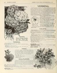 Keywords: Vick's garden and floral guide (16375564888).jpg jS FLOWER SEEDS <br> JAMES VICKS SONS ROCHESTER N Y <br> VERBENA <br> VERBENA <br> White Striped Scarlet <br> and Blue White Eye <br> The Four for 30 cents <br> TORENIA <br> Trailing plants for vases baskets etc Annual <br> Torenia Fournieri for moist shady location; velvety-blue flowers <br> six inches 10 <br> Bailloni deep yellow and maroon 10 <br> The Bride new large flowers upper lip white; side segments and <br> lower hp pink ; bottom of corolla yellow 25 <br> VINCA <br> Periwinkle Annual The past summer Vincas have <br> been grown successfully as bedding plants in the Rochester <br> parks and if better known would be more extensively used <br> for this purpose Seeds can be started in the house or <br> under glass; bloom from early summer until destroyed by <br> frost ; and may be potted for the house before frost <br> Vinca rosea rose 10 <br> rosea alba white red eye 10 <br> rosea nova species white 10 <br> Mixed varieties 10 <br> WALLFLOWER <br> By growing Wallflower plants in the ground and trans- <br> planting to pots in the autumn or better by placing plants <br> VINCA in pots when taken from the seed bed and sinking the pots <br> to the rim in earth good plants will be secured for winter <br> flowering in the house Give a cool room and plenty of <br> water Where winters are not very severe the Wallflowers make most desirable plants <br> giving plenty of early spring flowers <br> Wallflower Fine mixed colors fragrant; double; perennial 15 <br> Flowering first season fine mixed colors single 5 <br> Very few annuals will make such a gorgeous display during the summer <br> months or furnish more flowers for cutting than the Verbena Start seed in <br> the house or under glass early in the spring and transplant after three or four <br> inches of growth Good healthy plants can be produced from seed as readily <br> as almost any tender annual They flower in July and continue strong and <br> healthy until destroyed by frost A strange fact that is not generally known <br> is that nearly all the Verbenas raised from seed are fragrant the light colored <br> varieties particularly so The past quarter of a century we have made a spe- <br> cialty of Verbenas and our stock to-day stands at the head <br> Verbena Auricula-flowered or White-eyed mixed colors xo <br> Striped excellent flowers with broad Carna- <br> tion-like stripes 10 <br> Scarlet brightest scarlet quite true 10 <br> Pure White quite true from seed 10 <br> Cloth of Gold iThe golden yellow leaves <br> present a unique appearance fine mixed 10 <br> Ccerulea Blue with white eye 10 <br> Lutea Primrose yellow 10 <br> Purplish Violet with large white center 10 <br> One package of each of above eight OO cents <br> dX S \ Z £ Verbena hybritla extra large flow- <br> ers fine mixed colors choice seed <br> saved only from the most beautiful named flowers ounce 2 10 <br> Mixed colors 5 <br> VIOLETS <br> Viola Odorata is the well-known English Violet a free flowering hardy <br> perennial Easily grown from seed though somewhat slow in germinating; suc- <br> ceeds best in a partially shaded moist place <br> Viola odorata semperflorens deep rich violet blue and deliciously <br> fragrant 10 <br> The Czar in blue or white sweet scented each 10 <br> Viola COrnuta This is a beautiful old border flower which since its <br> introduction into the summer flower-garden has been taken in hand by the hybri- <br> dizer and many lovely forms of it now enrich our collections It commences <br> flowering early in the season and continues until frost Habit and constitution <br> robust; flowers large and delicately fragrant <br> Viola cornuta Admiration magnificent flowers of a beautiful dark blue xo <br> Mixed colors dark blue lavender and white 10 <br> Viola lutea grandiflora 10 <br> splendens large yellow 10 <br> VALERIANA Fine for borders 5 <br> VIRGINIAN STOCK Hardy annual; fine for small beds or edgings <br> Mixed colors ounce 35 cents 5 <br> WILD GARDEN- Mixed seeds per ounce 20 cents 5 <br> VVHITLAVI A Annual with delicate foliage and drooping clusters of blue and white <br> bells Mixed varieties 5 <br> VIOLET CZAR 43864395 149533 78224 Page 38 Text http //www biodiversitylibrary org/page/43864395 1900 10 5962/bhl title 78224 Henry G Gilbert Nursery and Seed Trade Catalog Collection ; James Vick's Sons Rochester N Y Biodiversity Heritage Library Vick's garden and floral guide 1900 Garden Stories Catalogs Commerce Flowers Gardening James Vick's Sons Rochester N Y Rochester N Y Seeds Vegetables U S Department of Agriculture National Agricultural Library bhl page 43864395 dc identifier http //biodiversitylibrary org/page/43864395 James Vicks Sons bhlGardenStories Verbena Violets BHLinbloom james vick's sons rochester n y rochester n y u s department of agriculture national agricultural library james vicks sons bhlgardenstories bhlinbloom Information field Flickr posted date ISOdate 2015-02-17 CC-BY-2 0 BioDivLibrary https //flickr com/photos/61021753 N02/16375564888 2015-08-24 22 57 14 cc-by-2 0 PD-old-70-1923 Verbena Vick's garden and floral guide Photos uploaded from Flickr by Fæ using a script |