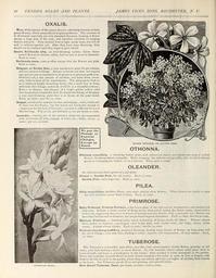 Keywords: Vick's garden and floral guide (16375794900).jpg 68 TENDER BULBS AND PLANTS <br> JAMES VICKS SONS ROCHESTER N Y <br> OXAL1S <br> Many of the species of this genus deserve cultivating because ot their <br> pretty flowers which are produced in great profusion The varieties of <br> O flonbunda especially are very abundant bloomers keeping in flower <br> during a large part of the year and therefore excellent for hanging <br> baskets and pots They succeed best in light sandy loam but will do <br> well in ordinary garden soil After they have done flowering they <br> should not be watered until they begin to grow afresh <br> Oxalis floribunda alba an ever-blooming variety; leaves three- <br> parted flowers in clusters; white half an inch or more in diameter <br> Each 10 cents <br> floribunda rosea same as alba; except that the flowers are pink <br> Each 10 cents <br> Ortgiesi or Golden Star a very satisfactory plant for pot culture <br> and has attractive foliage Always in bloom and does not require <br> any special care or treatment to be grown to its greatest perfection <br> Ordinary soil a fair amount of sunshine and water when neces- <br> sary seem to meet all its requirements The plant grows from 12 <br> to 15 inches in height branching freely like a small tree in form <br> with dark olive foliage underside of which is a beautiful crimson ; <br> flowe s in clusters star-shaped of a bright golden yellow color <br> that harmonizes beautifully with the handsome foliage of the plant; <br> a true ever-blooming plant that is in bloom all the year round <br> Each 15 cents ; two for 25 cents <br> Deppei excellent for summer borders and edgings ; color violet-red <br> It bears but few flowers but the leaves are handsome enough to <br> compensate for the lack of blossoms ; one pint is sufficient for a row <br> fifty feet long Pint 50 cts; per half pint 25 cts; per dozen 10 cents <br> lasiandra crimson one of the prettiest plants we are acquainted <br> with for borders of beds edgings of walks etc ; bulbs dozen 10 <br> cents; per 100 50 cents <br> We pay the <br> Postage or <br> Express <br> Charges <br> Except as <br> Noted <br> OXALIS ORTGIESI OR GOLDEN STAR <br> OTHONNA <br> Othonna crassifolia a charming basket plant with cylindrical leaves and pretty star-shaped yellow <br> flowers blooming almost constantly Habit drooping but delicate and graceful and should be always <br> grown in a hanging pot basket or on a bracket Price each 10 cents <br> OLEANDER <br> An old-fashioned shrub grown as a pot plant <br> Oleand r Double Pink the old variety Each 15 cents <br> Double Pink extra large size Each 30 cents <br> PILEA <br> Pilea serpyllifolia Artillery Plant very small pinkish white flowers <br> the least moisture causes them to burst Each 15 cents <br> When flowers are ready to open <br> TUMICROSE PEARL <br> PRIMROSE <br> Baby Primrose Primula Forbesii a fine house plant of the very easiest management and needing but <br> little care It forms a dense rosette of fleshy leaves from which spring the flower stems about twelve <br> inches tall supporting three tiers or whorls of delicate rosy lilac flowers with a pale gold eye; flowers not <br> more than half an inch in diameter but are produced in great abundance Each 25 cents; two for 40 cents <br> Mexican Primrose a charming plant which in freedom of bloom excels all others Flowers almost <br> three inches in diameter cup-shaped; color bright pink with scarlet veins and large showy white <br> center A plant of easy culture Each 15 cents ; two for 25 cents <br> Primula obconica grandiflora perpetual blooming bearing large trusses of flowers on long stems well <br> the above foliage ; color pale lilac shading to white ; requires cool temperature ; of easy culture Each <br> 20 cents <br> TUBEROSE <br> The Tuberose is a beautiful pure white wax-like very sweet-scented double flower growing on tall <br> stems each stem bearing a dozen or more flowers In cold latitudes obtain tubers early plant them in <br> boxes of earth and keep in a warm place in the house; when weather is warm transplant in the garden <br> Those who want this beautiful flower in early winter can plant a few bulbs in spots in July or August sink <br> them to the rim in earth in the garden where they can remain until the cool nights of autumn then remove <br> to the house Our Tuberoses are all of our own growing and splendid bulbs <br> New Dwarf Tuberose Pearl per dozen 50 cents ; each 5 cents 43864369 149533 78224 Page 68 Text http //www biodiversitylibrary org/page/43864369 1900 10 5962/bhl title 78224 Henry G Gilbert Nursery and Seed Trade Catalog Collection ; James Vick's Sons Rochester N Y NameFound O flonbunda NameFound Othonna NameConfirmed Othonna EOLID 6274018 NameBankID 1803433 NameFound Othonna crassifolia NameConfirmed Othonna crassifolia Harv Harv EOLID 6274051 NameFound Oxalis floribunda alba NameConfirmed Oxalis floribunda alba NameBankID 9372308 NameFound Oxalis ortgiesi NameConfirmed Oxalis ortgiesi NameBankID 10740113 NameFound Pilea NameConfirmed Pilea EOLID 11194888 NameBankID 2576530 NameFound Pilea serpyllifolia NameConfirmed Pilea serpyllifolia Poir Weddell EOLID 486209 NameBankID 601902 NameFound Primula obconica grandiflora NameConfirmed Primula obconica grandiflora NameBankID 5850683 Biodiversity Heritage Library Vick's garden and floral guide 1900 Garden Stories Catalogs Commerce Equipment and supplies Flowers Gardening James Vick's Sons Rochester N Y Rochester N Y Seeds Vegetables U S Department of Agriculture National Agricultural Library bhl page 43864369 dc identifier http //biodiversitylibrary org/page/43864369 James Vicks Sons bhlGardenStories Oxalis BHLinbloom james vick's sons rochester n y rochester n y u s department of agriculture national agricultural library james vicks sons bhlgardenstories bhlinbloom Information field Flickr posted date ISOdate 2015-02-17 CC-BY-2 0 BioDivLibrary https //flickr com/photos/61021753 N02/16375794900 2015-08