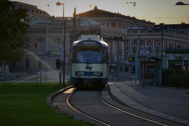 Keywords: vienna tram street scene downtown cityscape atmospheric morgenstimmung morning light morning badner bahn train traffic city austria stop city view dark station