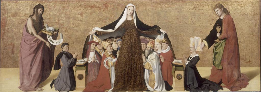 | Keywords: Vierge de miséricorde - Enguerrand Quarton - Musée Condé.jpg  Artwork Q2252360 Creator Enguerrand Quarton Photo by René-Gabriel Ojéda Schutzmantelmadonna der Familie Cadard The w Virgin of Mercy La vierge de miséricorde de la famille Cadard de Altarbild Cadard Cadard Altarpiece Donated by the Cadard family A February 1452 contract specified that both Quarton and Pierre Villate would work on the piece but art historians have struggled to detect two hands in the works as it exists although Dominique Thiébaut suggests some of the sheltering figures are weaker than the rest of the work and by Villate One possibility is that Villate was responsible for a w predella now lost 1452 Tempera on panel cm 66 187 Institution Musée Condé Object history ProvenanceEvent 1452 commission Pierre Cadard Église des Célestins d'Avignon 00000077126 accession number PE111 R -G Ojeda/RMN Digitization appears to be cropped from RQEolVbsyH13Cg PD-old-100 1452 paintings Enguerrand Quarton French paintings in the Musée Condé Paintings of John the Baptist in France Paintings of Saint John the Evangelist Paintings of Virgin of Mercy Google Art Project works by Enguerrand Quarton Google Art Project works in Château de Chantilly 15th-century paintings in the Musée Condé 15th-century donor portraits with Madonna 15th-century paintings of John the Baptist 15th-century religious paintings in France |